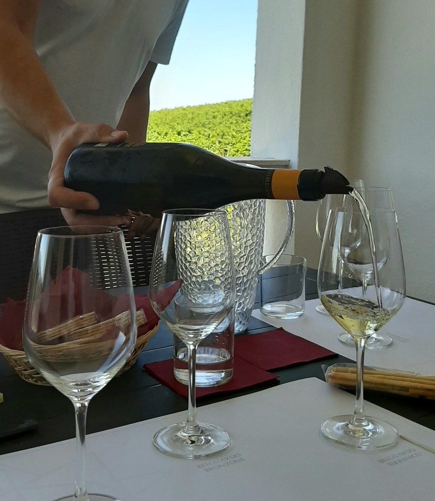 Maistoimme ensin viinitilan tuottamaa vermentinoa (Vermentino di Toscana IGT), joka ei ollut ollenkaan vermentinolle tyypilliseen tapaan kuiva tai katkera, sinänsä yksinkertainen viini, mutta hienostunut versio vermentinosta. Tämän lisäksi maistoimme Belguardon vermentinoa nimeltä Codice V, jonka koostui 20%:sti viinirypäleistä, joiden käymisprosessi on tapahtunut saviruukussa, 30% viinin rypälemehusta on käynyt viinirypäleiden kuorten kanssa, ja 50% koostui viinirypälemehusta, joka syntyi perinteisessä valkoviinin käymisprosessissa. Tämä oli ensimmäinen kerta, kun kuulin vastaavasta blendistä eli sekoituksesta, ja viini olikin erityisen monivivahteinen ja mineraalinen. Maistoimme myös roseviiniä mutta se ei tehnyt suurta vaikutusta. Tämän jälkeen maistoimme kahta punaviiniä. Toinen oli nimeltään Tirrenico, ja se oli sekoitus Cabernet Sauvignonia 65%, Alicantea 20%, Cabernet Franca 10%, Petit Verdota 5% ja kiitos Cabernet Francin viinin tuoksu oli vivahteikas sisältäen mustaherukkaa, yrttejä, suklaata ja paljon muuta. Vaikka tuoksu antoi olettaa, että viini olisi raskas, se oli kuitenkin yllättävän raikas ja mineraalinen, tanniinit olivat hienon hienoja ja viini sopisi vaikka mausteisen aterian kanssa nautittavaksi. Toinen punaviini, nimeltään Bronzone oli tyypillinen Morellino di Scansano viini DOCG sisältäen 100%.sti Sangiovese viinirypälettä, ja viini jätti teräksisen tanniinien maun suuhun. Bronzone olikin klassillinen viini kunnon pihvin seuraksi. Maistoimme myös Belquardon valmistamaa oliiviöljyä, johon rakastuin kenties kaikkein eniten.