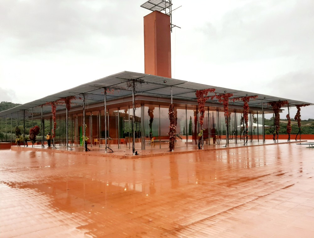 Tämän lisäksi Rocca di Frassinellon ainutlaatuisuus on sen arkkitehtuurissa, sillä sen on suunnitellut kuuluisa italialainen arkkitehti Renzo Piano. Rakennuksessa toimii viinitilan tuotanto ja kellari, toimistorakennukset, ja viinimyymälä kaikki yhdessä. Rocca di Frassinellon viinitila näkyy jo kaukaa punaisen tornin toimiessa maamerkkinä, ja se on näyttävä modernin tyylinsä ansiosta, ja sen kontrastin, jonka se luo levätessään perinteisessä Toscanalaisessa maisemassa viiniviljelmien syleilyssä. (Valitettavasti satoi niin paljon, etten saanut siitä kunnon kuvaa, mutta vierailemalla sivustolla voi nähdä rakennuksen.)