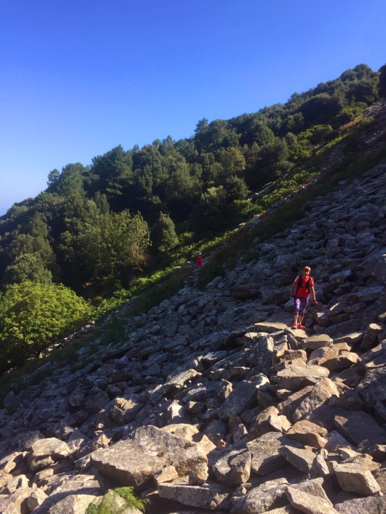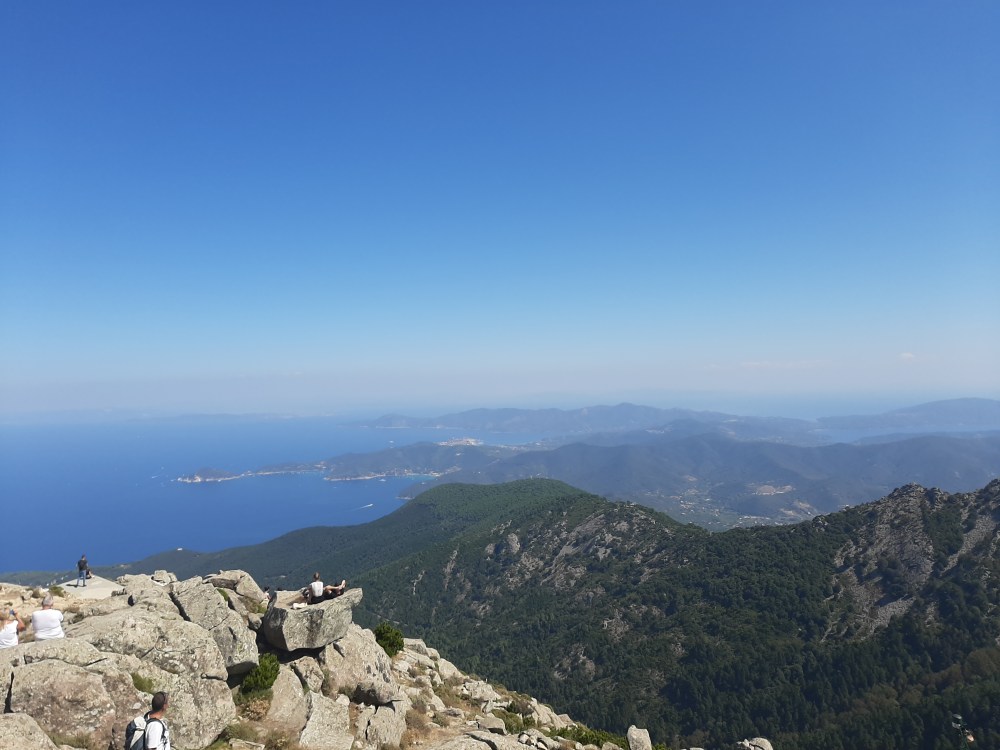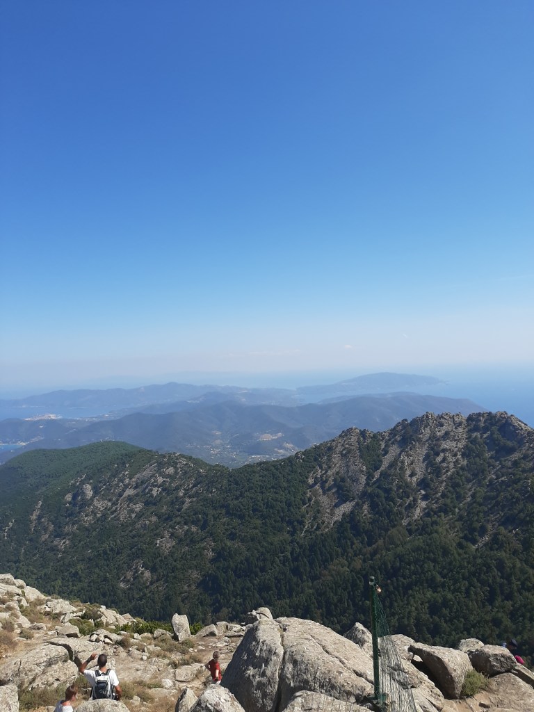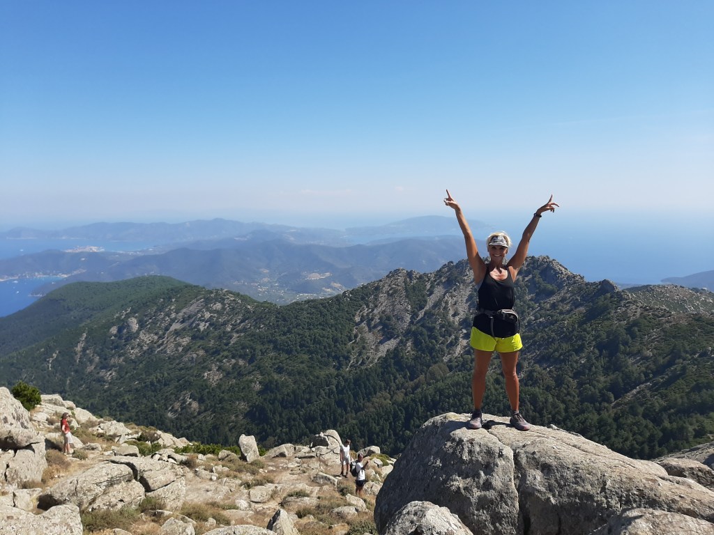 Ja ne rajat tulivat todellakin vastaan.  Kyseessä oli vajaan 12 kilometrin vaellus, joka ei siis matkana ole kovin pitkä, mutta käsitti lähinnä nousua kivipoluilla ja kivilaattojen välissä kohti Elban korkeinta vuorenhuippua Monte Capannea (1019 m). Maisemat olivat aivan huikeat ja nautin retken vaativuudesta siitäkin huolimatta, että onnistuin naarmuttamaan polveni ja käsivarteni. Melkein kun luulin selvinneeni kunnialla matkasta, eteeni nousi viimeinen nousu vuoren huipulle, joka oli todella jyrkkää kapuamista kivistä polkua pitkin. Tällöin voimani loppuivat täysin. Hengitys ei kulkenut, heikotti ja pääsin pari metriä kerralla eteenpäin, mutta lopulta, uskomatonta kyllä, saavutin vuoren huipun!