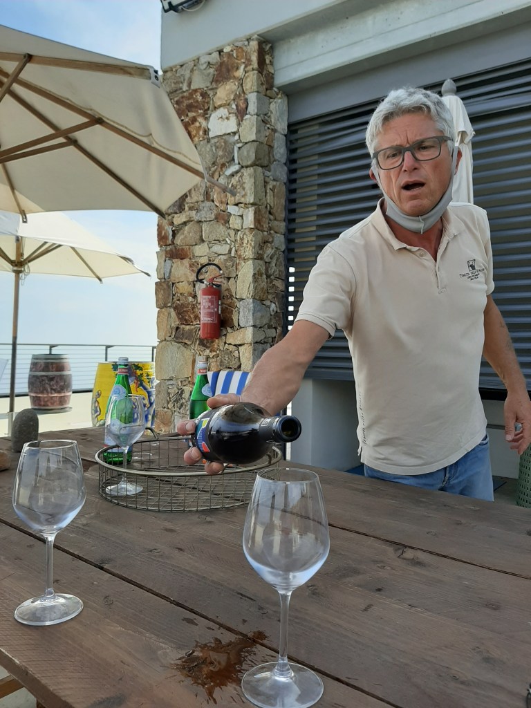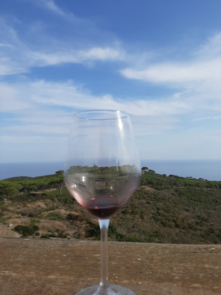 Vaikka viinitilalle on matkaa, ilman eksymistäkin, se kannatti, sillä maisema, joka avautui viinitilan terassilta, oli huikaiseva. Edessämme siinsi sininen Välimeri ja sen keskellä viiniköynnökset.
