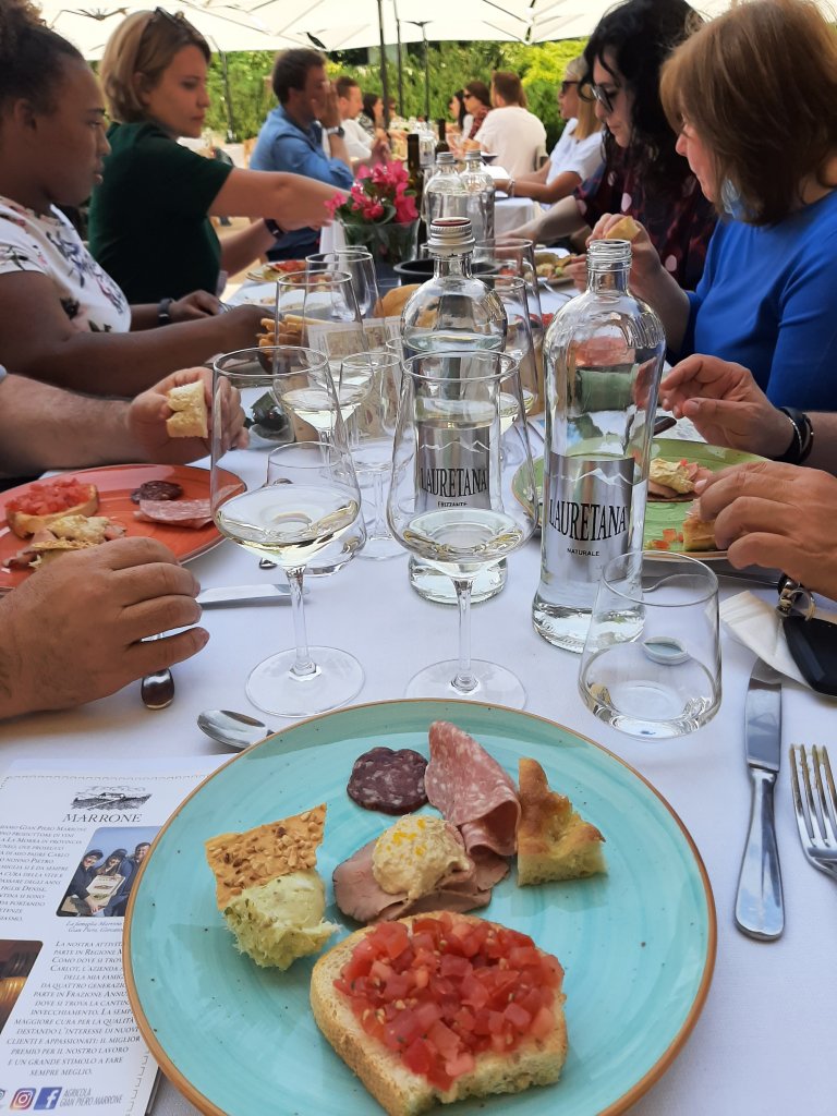 Tämän jälkeen olin varannut meille lounaan ja viininmaistelutilaisuuden toiselta viinitilalta. Siirryimme Cannubista Morraan Agricola Gian Piero Marronen https://www.agricolamarrone.com/en/vini/ tilalle. Meillä oli hyvin rento lounashetki, jonka yhteydessä tarjoiltiin maisteltavaksi tilan viinejä. Periaatteessa idea oli hyvä, mutta käytännössä he olivat haukanneet liian ison palan, sillä meitä oli todella paljon lounastamassa, joten palvelu ontui ja lopulta meille tuli kiire. Minua jäikin harmittamaan hiukan se, että emme onnistuneet paneutumaan heidän viineihinsä rauhassa.