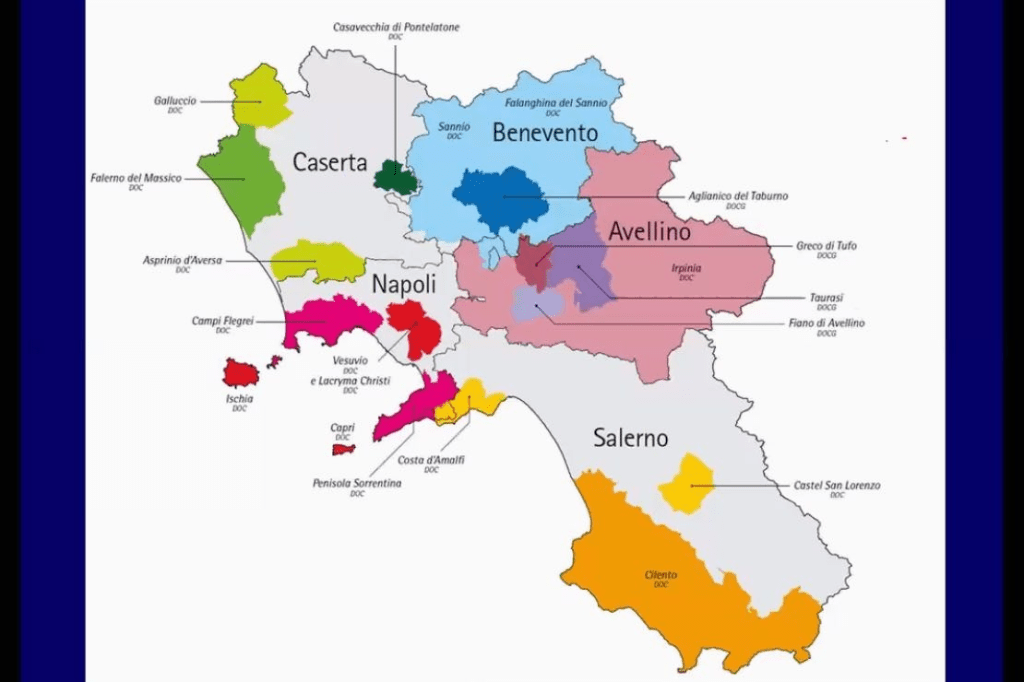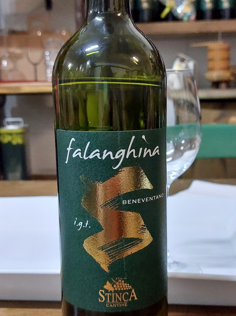Falanghina IGT on yksi yleisemmistä viinirypäleistä, joita viljellään Napolin alueella eli Campanian-maakunnassa. Tilan Falanghinan viinirypäleet kerättiin Beneventon alueelta. Tämän vuoksi viini luokiteltiin IGT viiniksi. IGT eli Indicazione Geografica Tipica, tarkoittaa että viini on tuotettu tietyllä maantieteellisellä alueella. Yleensä tähän luokkaan kuuluvat viinit, jotka on tuotettu erittäin suurilla alueilla. Kuten tässä tapauksessa viinirypäleet kasvoivat Beneventon kunnassa, joka kuuluu Campanian maakuntaan, mutta viini valmistettiin Sorrenton alueella.