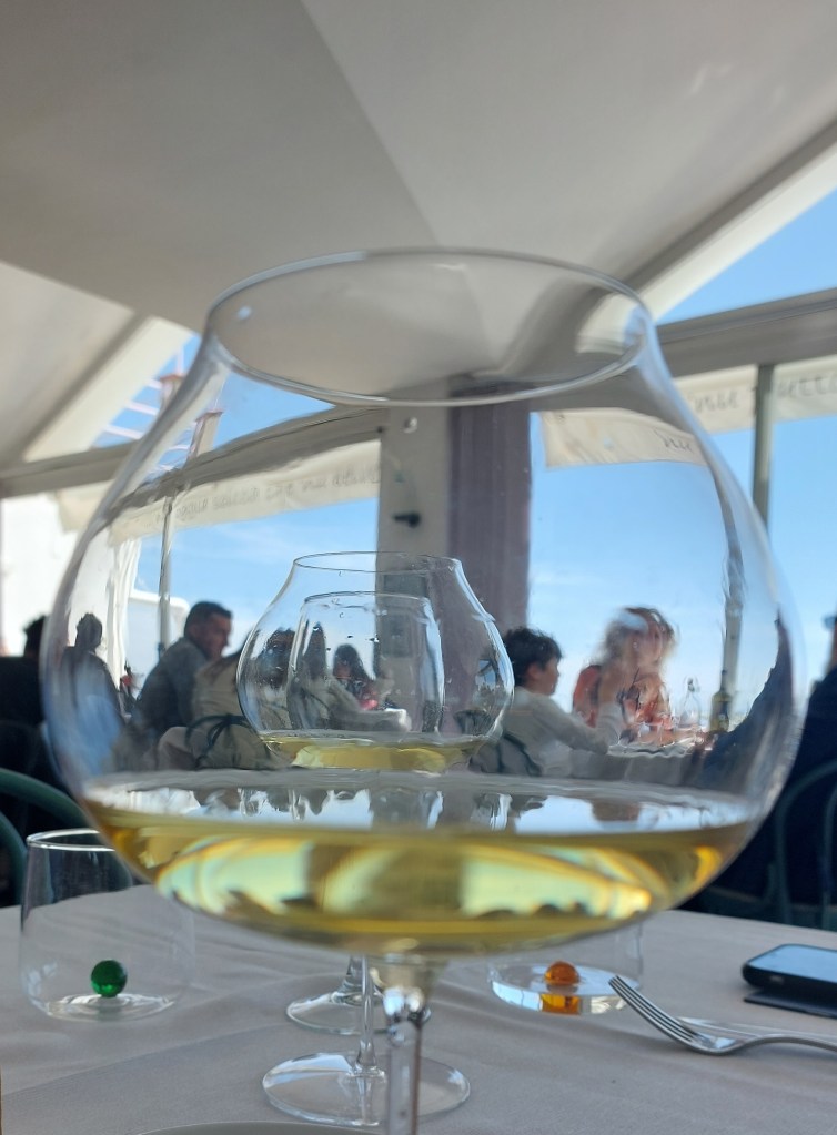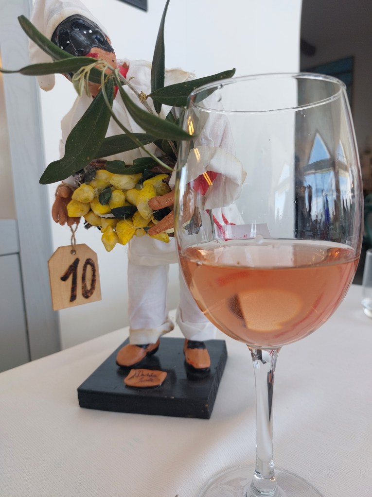 Seuraavaksi meillä oli vuorossa lounas, johon oli siis yhdistetty kolme Marisa Cuomon viiniä. Ensimmäinen oli roséviini Costa d’Amalfi Rosata, joka tarjoiltiin alkupalan kanssa. Roséviini monimuotoinen niin aromeiltaan ja maultaan (50% Piedirosso, 50% Aglianico.) Toiseksi pastan kanssa meille tarjoiltiin Costa d’Amalfi Bianco ( Falanghina 60% Biancolella 40%), joka väriltään oli sitruunaisen keltainen, tuoksultaan yrttinen ja sitrushedelmäinen, ja maultaan tasapainoinen ja täyteläinen. Kolmanneksi pääruuan seuraksi tarjottiin puolestaan Furore Bianco Fiorduva, joka on valmistettu harvinaisista paikallisista viinirypäleistä (Fenile 30%, Ginestra 30%, Ripoli 40%) ja kypsyi myös tammitynnyrissä. Viini oli tyylikäs ja monimuotoinen, jonka aromeista löytyi niin yrttejä, sitrushedelmiä kuin eksoottisia hedelmiä, ja oli suussa täyteläinen, hapokas, pehmeä, mineraalinen. Vaikka mielestäni viini oli erinomainen, kritisoin mielessäni sitä, että meille tarjoiltiin viinistä vuoden 2020 vuosikertaa, josta maistui vielä tammitynnyrin karvaus.
