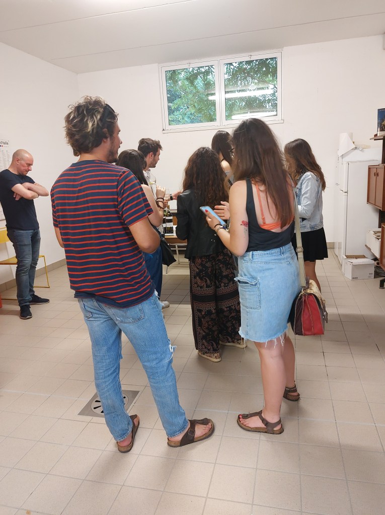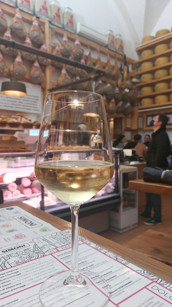 Mutta kaiken kaikkiaan miellyttävä ja mielenkiintoinen tilaisuus, ja saimme myös syödäksemme Emilia- Romagnan alueelle tyypillisiä tigelle-leipiä ja eri lihaleikkeleitä viinin maistelun yhteydessä. Viinimaistelun ajan tyttäremme pitikin huolta, että sai myös syödäkseen. Koira teki puolestaan ystävyyttä kaikkien kanssa.