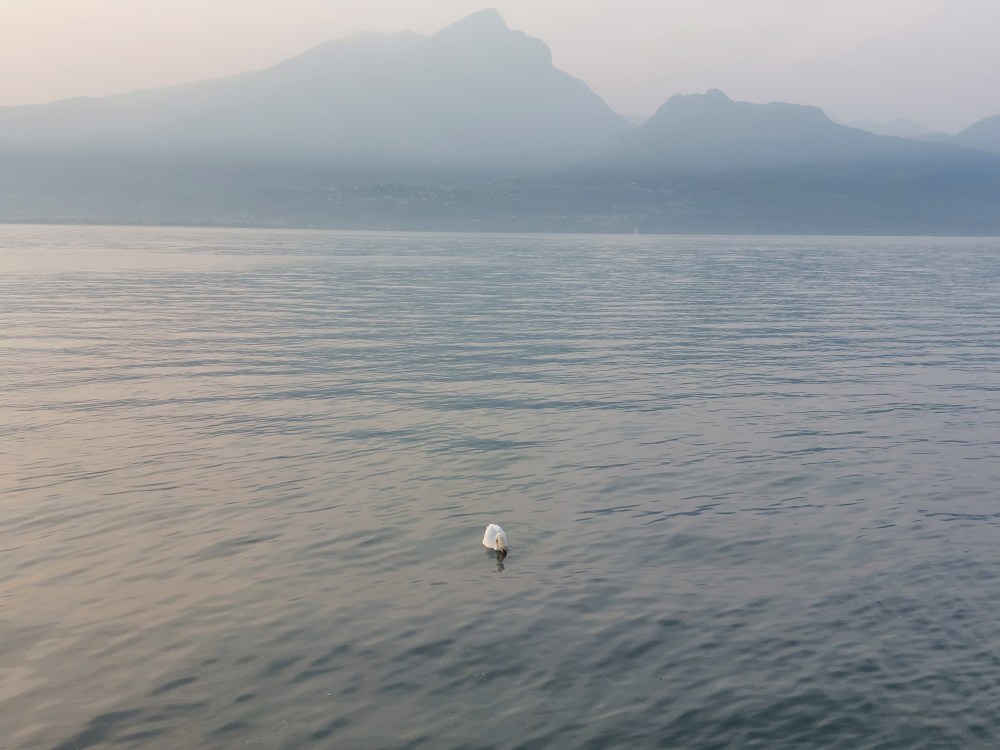 Maltoimme viipyä hetken huoneessa, kun jo kiiruhdimme ihastelemaan Gardajärveä. Gardajärven yllä oli vaaleansininen utuinen pilviverho, jonnekin oli laskemassa parhaillaan aurinko, ja joutsenet sukivat auringonsäteissä sulkiaan. Tunnelma oli kuin satumaasta, ja kaikki äänetkin tuntuivat ympäriltä vaimenneen.