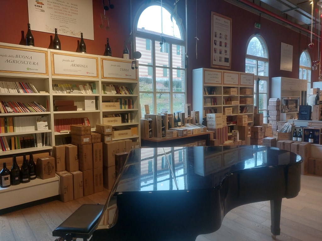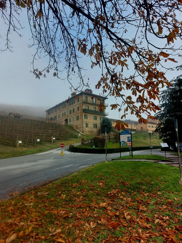 Aamulla kun saavuimme ensimmäisen viinitilalla, sää oli tyypillisen Piemontelaisen talvinen, kostea ja harmaan sumuinen. Kylmyys tuntui tarrautuvan luihin asti, eli täydellinen ilma Barolon viinien maisteluille. Olin varannut ensimmäisen viinitilavierailun tunnetulta Fontanafreddan viinitilalta, ns. Villaggio Narrantesta. ( Villaggio Narrante in Fontanafredda & Casa di E. Mirafiore.) Kyseessä olikin pieni kylä kauniine rakennuksineen, joka piti sisällään viinitilan tuotantotilojen lisäksi hotellin, ravintolan ja paljon muuta. Sisääntulo aulassa oli valtaisa viinimyymälän, hotellin kahvilan ja auditoriumin yhdistelmä, jossa pidetään kulttuuritapahtumia.