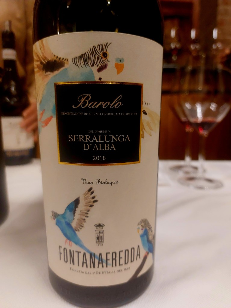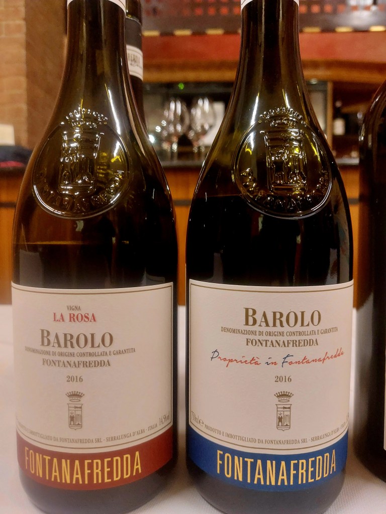 Mielenkiintoisia olivat sen sijaan kaksi seuraavaa viiniä Barolo DOGC Vigna La Rosa ja Barolo DOCG proprietà in fontanafredda, sillä molempien viinien Nebbiolo-viinirypäleet kerättiin samalta alueelta ja molemmat olivat 2016 vuosikertaa, mutta Barolo DOCG proprietà in fontanafredda valmistettiin tietystä arvostetummasta viinitarhan rypäleistä, jossa maaperä erosi hiekkaisuuden ansiosta. Viinit muistuttivat toisiaan, mutta aromeissa oli pieniä eroja, ja suussakin toinen maistui hiukan mineraalisemmalta kuin toinen ja toinen oli pehmeämpi. Molemmat olivat jo valmiita ja harmonisia, sillä tanniinit tai raikkaus eivät korostuneet liiallisesti. Tosin ne eivät saaneet mielikuvitustani liikkeelle ja fantisoimaan millaiseksi viinit voisivat ajan myötä kehittyä. Mutta ehdottomasti molemmat viinit olivat paitsi laadukkaita mutta myös hyvin miellyttäviä.
