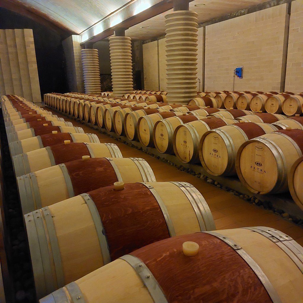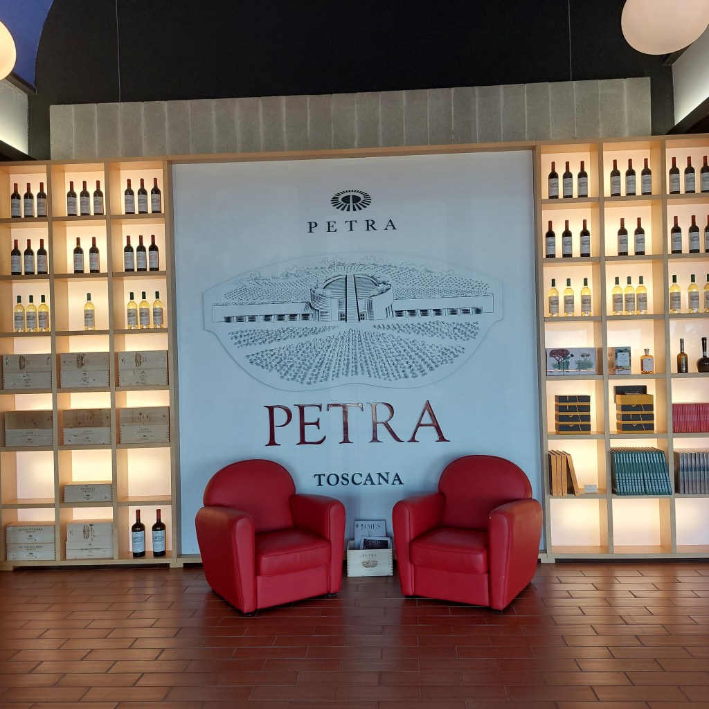 No jos asuntoasia ei edistynyt, niin viiniasiat kuitenkin. Olin onnistunut varaamaan kauan suunnittelemani viinitilavierailun Petran-viinitilalle https://www.petrawine.it/it/, jonka päärakennus oli kuuluisa arkkitehtuuristaan (kuten myös Rocca di Frassinello– viinitila, jossa olimme aiemmin vierailleet). Olin usein ihaillut Petran lähes salaperäiseltä vaikuttavaa mahtipontista ja futuristista viinitilarakennusta, joka erottui muuten keskiaikaisesta ja vaatimattomasta ympäristöstään. Olinkin hyvin utelias näkemään rakennuksen läheltä, ja kun metallinen viinitilan portti avautui, olin suorastaan jännittynyt, sillä vihdoin Petran salaisuus paljastuisi. Totta tosiaan, matka kukkulalle, jossa Petra sijaitsi, oli vaikuttava viinitilan rakennuksen kohotessa kunnioitusta herättävänä, jopa hiukan pöyhkeilevänä, edessämme.