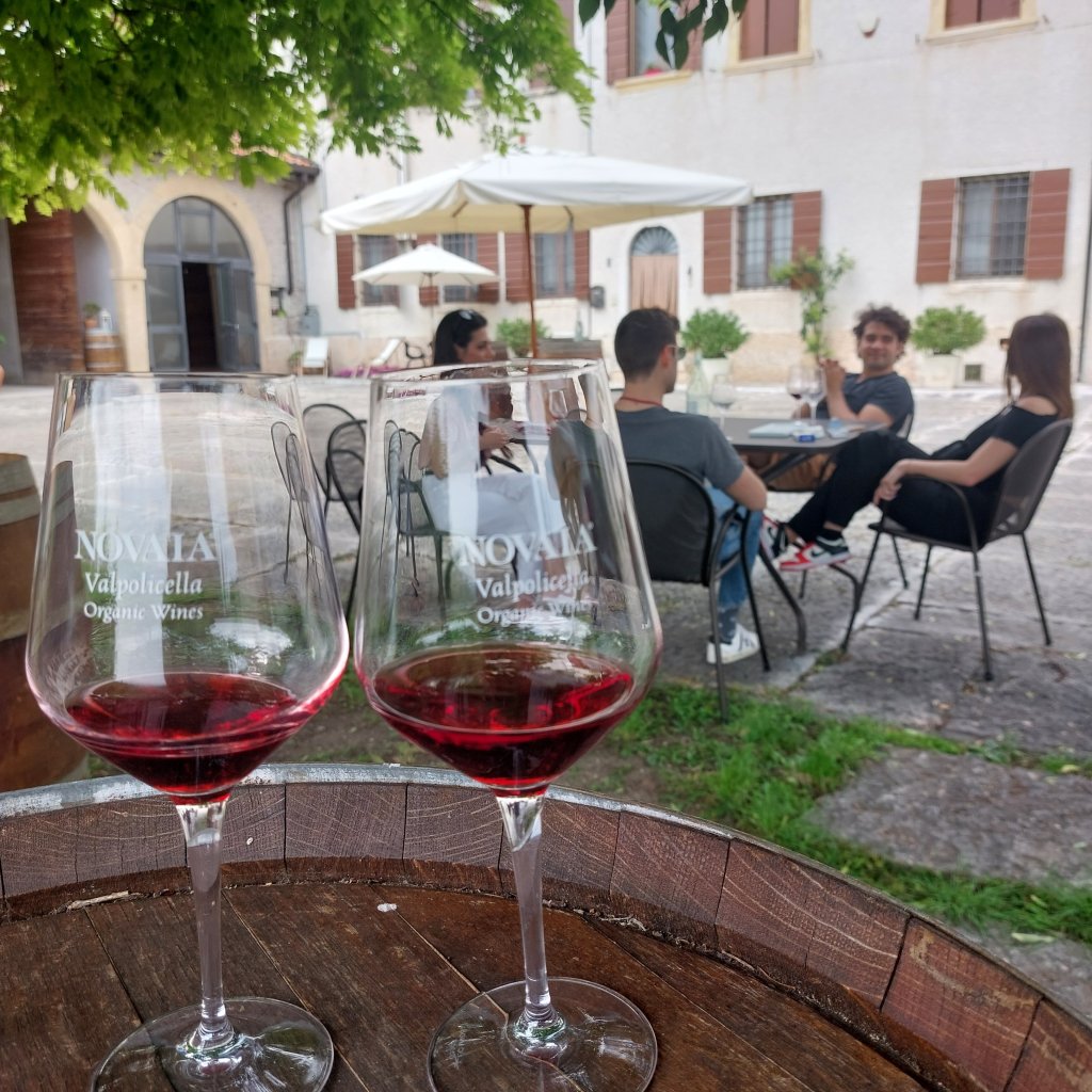 Viimeinen viinitila Home | Novaia | Azienda Agricola, jonne ajoimme, sijaitsi Marano di Valpolicella alueella, Valpolicellan sydämessä ja arvostetuimmalla alueella. Viinitilan rakennus sijaitsi korkealla kukkulalla, ja kyseessä oli vanha kartano, jonka sisäpihalta avautui aivan upea näköala. Jälleen kerran kyseessä oli sukupolvelta toiselle siirtynyt perheyritys. Täällä oli kuitenkin siirrytty täysin biodynaamisia viinejä, jonka vuoksi ne erottuivat. Viinitilalla sai maistaa kolmea tilan viiniä yhteishintaan 15€. Edelleen tilalla valmistettiin perinteisiä viinejä Valpolicella Classico Superiore, Ripasso ja Amarone, mutta biodynaamisuus toi viineihin oman omalaatuisuutensa, kuten kauniin kirkkaan läpinäkyvän värin, ja appassimentosta huolimatta viinit olivat kevyitä maultaan ja eivätkä liian hedelmäisiä. Toki myös nämä viinit olivat alkoholipitoisuudeltaan vahvoja. Miellyin tilan viineihin, sillä usein Valpolicellan viinien täyteläisyys tuntuu jopa liian raskaalta, mutta Novaian tilan viinit olivat miellyttävän elegantteja ja juuri sopivan täyteläisiä.