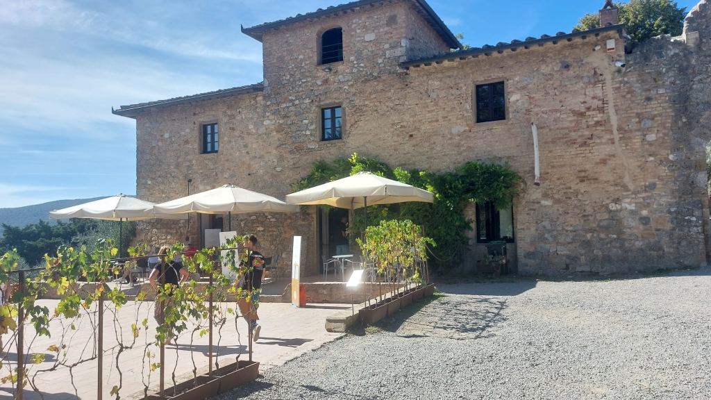 Lähdimme ajamaan kohti Toskaanaan perjantai-illalla töiden jälkeen. En ollut varannut yöpymispaikkaa San Gimignanon keskustasta, vaan läheisestä pikkukylästä nimeltä San Donato https://g.co/kgs/Rdpkqs. Kun saavuimme illalla myöhään kylään, paikka vaikutti lähes Disneylandin lavasteelta. Niin siisti ja idyllinen se oli. Olin varannut meille huoneiston B&B:sta nimeltä Antica Dimora B&B | San Gimignano (antica-dimora.it). B&B oli ihan mukava asunto, mutta meitä vastapäätä sijaitsi aivan ihastuttava hotelli nimeltä Locanda dei Logi | Wine & Food, mutta jonne eivät lapset eivätkä koirat olleet tervetulleita, eli ei meille sopiva hotelli.