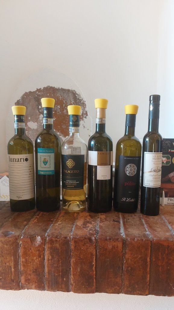 Aivan ensimmäinen Vernaccia oli https://borgotollena.com/ tuottama Vernaccia di Gimignano (jota ei heidän sivustolla näytä olevan tällä hetkellä myynnissä.) Tämä Vernaccian väri oli haalean oljen värinen, ja tuoksuiltaan se oli pelkistetty, sisältäen keltaista omenaa, greippiä ja valkoisia kukkia, ja maultaan se oli raikas, selkeä ja yllättävän pitkäkestoinen. Ei missään nimessä yksinkertainen viini, vaikka olikin ns. perus Vernaccia di San Gimignano.