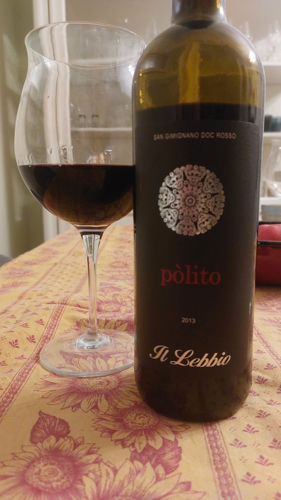 Maisteluun kuului myös yksi alueen punaviini, sillä punaviinilajikkeitakin alueella viljellään ja tunnetuimpia ovat Chianti dei Colli Senesi. Pòlito – Azienda Agricola Il Lebbio -tilan punaviini oli kuitenkin San Gimingano Rosso D.O.C. 90% Sangiovesesta valmistettu. Myös tämän punaviinin tuoksumaailma oli todella monipuolinen kirsikoista suklaaseen, maaperästä mausteisiin ja voimakkaisiin ruusuntuoksuihin. Tuoksut antoivatkin odottaa täyteläistä ja pehmeää kypsää viiniä, mutta hämmästyin kun viini oli raikas ja terävä siitä huolimatta, että kyseessä oli vuoden 2013 viini.
